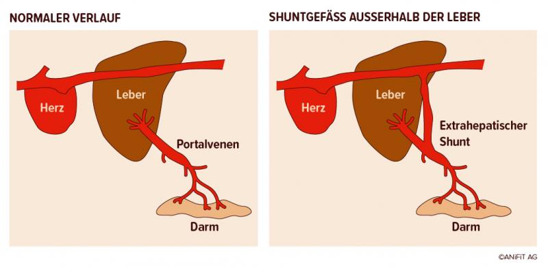 Der Leber Shunt ist eine Fehlbildung der Blutgefässe, die dazu führt, dass das Blut, das von den Bauchorganen kommt, nicht wie normal durch die Leber fliesst. Es gibt sozusagen eine «Kurzschlussverbindung» – ein Shunt – zwischen den Gefässen, und die Leber wird ausgelassen. So wird das Blut nicht in der Leber gereinigt und entgiftet, sondern vom Herzen wieder in den gesamten Organismus verteilt. Stoffe, die eigentlich ausgeschieden werden sollten, verbleiben im Körper. Der Organismus vergiftet sich innerlich.