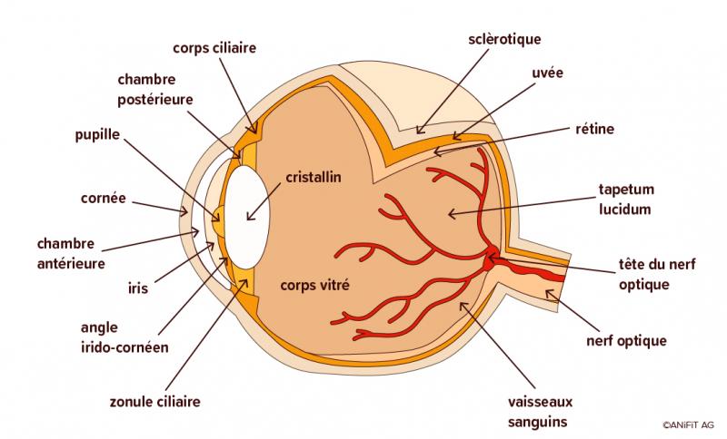 Les yeux «brillants» des chiens et des chats constituent une particularité étonnante. Ceci est dû au «tapetum lucidum» (tapis lumineux en latin): il s'agit d'une couche réfléchissante située derrière la rétine. Lorsque la lumière frappe cette couche, elle est réfléchie et traverse la rétine une seconde fois. La lumière est, pour ainsi dire, «doublée» et permet à l'animal de voir même au crépuscule et dans des conditions de faible luminosité.